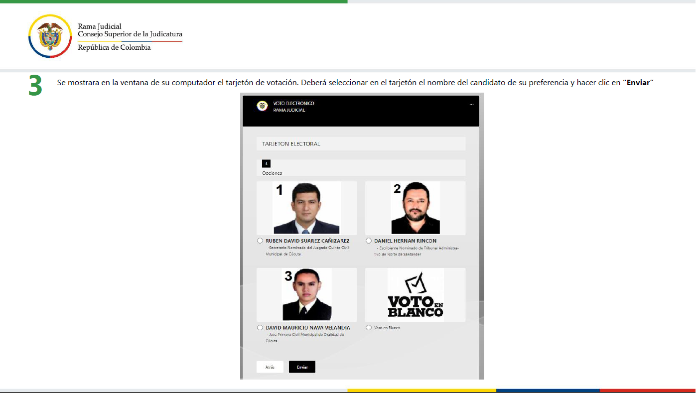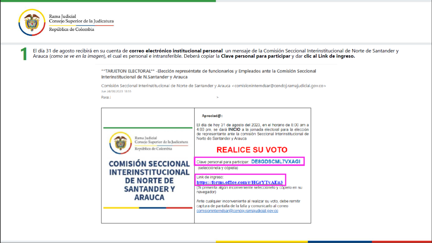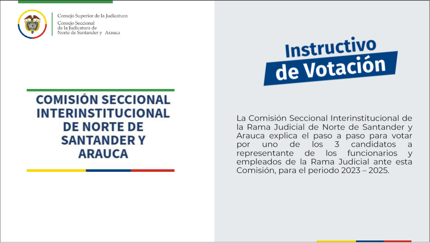 Comisión Interinstitucional, Interés generalInstructivo de votación Comisión Seccional Interinstitucional de Norte de Santander y Arauca Posted on 29 agosto, 202329 agosto, 2023 by Tribunal Superior Distrito Judicial de Cúcuta Presentación de Propuestas de los Candidatos a Representante de los Funcionarios y Empleados de la Rama Judicial ante la Comisión Interinstitucional Acuerdo PCSJA23-12089 “Por el cual se suspenden términos judiciales en el territorio nacional”