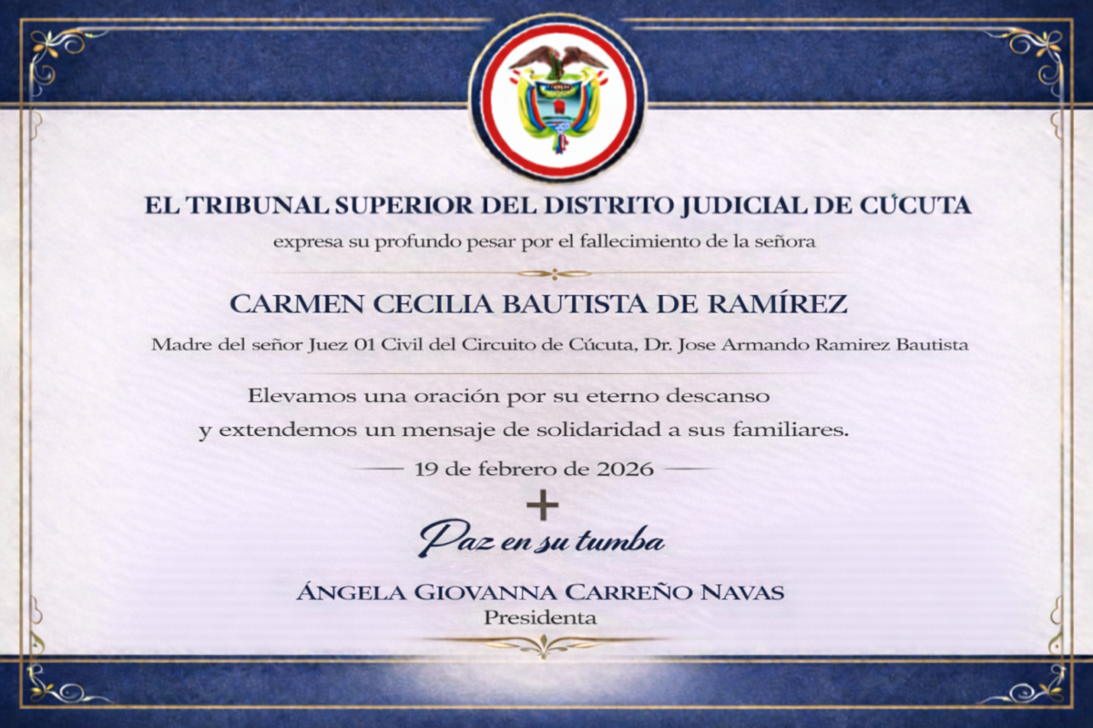 Interés general, Tribunal SuperiorNOTA DE CONDOLENCIA Posted on 20 febrero, 202620 febrero, 2026 by Tribunal Superior Distrito Judicial de Cúcuta NOTA DE CONDOLENCIA