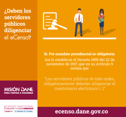 Los servidores públicos de todo orden, obligatoriamente deberán diligenciar el cuestionario electrónico (e Censo) con la información de la vivienda que habitan y del hogar que conforman, dentro de las fechas establecidas por el DANE para tal fin (Art. 9 – Decreto 1899 del 22 de Noviembre de 2017).