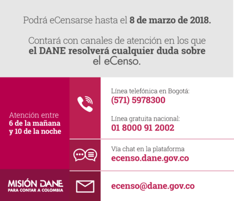 - Durante el proceso de diligenciamiento contará con los siguientes canales de atención: Chat, línea telefónica en Bogotá: (571) 597 8300, Línea gratuita nacional: 01 8000 912002 en el horario: de 6:00 a.m. a 10:00 p.m. y correo electrónico: ecenso@dane.gov.co.